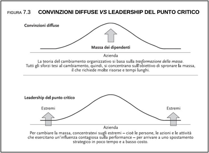 La figura 7.3 rappresenta il modo in cui la leadership del punto critico funziona. La teoria tradizionale del cambiamento organizzativo si basa sulla trasformazione della massa. Tutti gli sforzi tesi al cambiamento, quindi, si concentrano sull’obiettivo di spronare la massa, il che richiede molte risorse e tempi lunghi, un lusso che pochi dirigenti si possono permettere. La leadership del punto critico, invece, segue un percorso opposto. Per cambiare la massa, si concentra sulla trasformazione degli estremi: le persone, le azioni e le attività che esercitano un’influenza contagiosa sulla performance. Attraverso la trasformazione degli estremi, il leader del punto critico è in grado di apportare un cambiamento fin dalle fondamenta, in poco tempo e a basso costo, per attuare la nuova strategia.