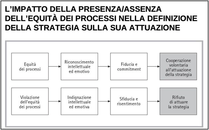 Quando l'equità dei processi ha luogo appieno, si ha un riconoscimento intellettuale ed emotivo che genera fiducia e commitment e porta alla cooperazione volontaria all'attuazione della strategia. In assenza dell'equità dei processi, o meglio quando l'equità dei processi viene violata, allora si ha una indignazione intellettuale ed emotiva che genera sfiducia e risentimento e conduce al rifiuto di attuare la strategia. Peggio di così non si può.