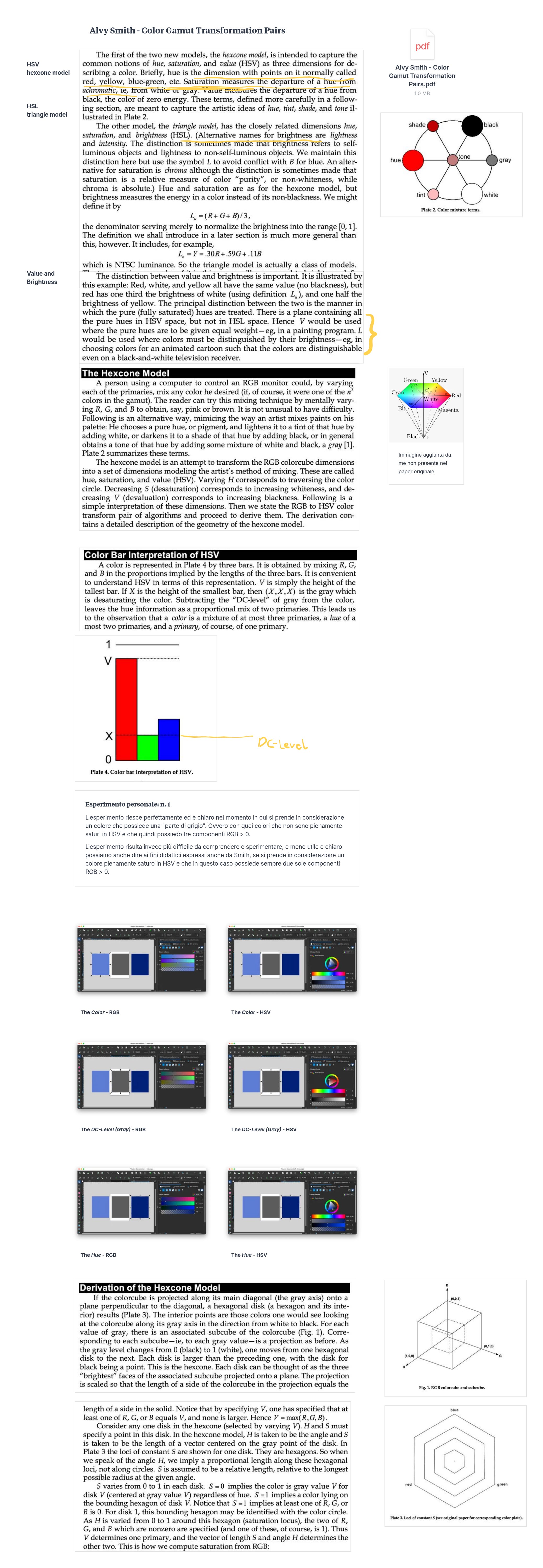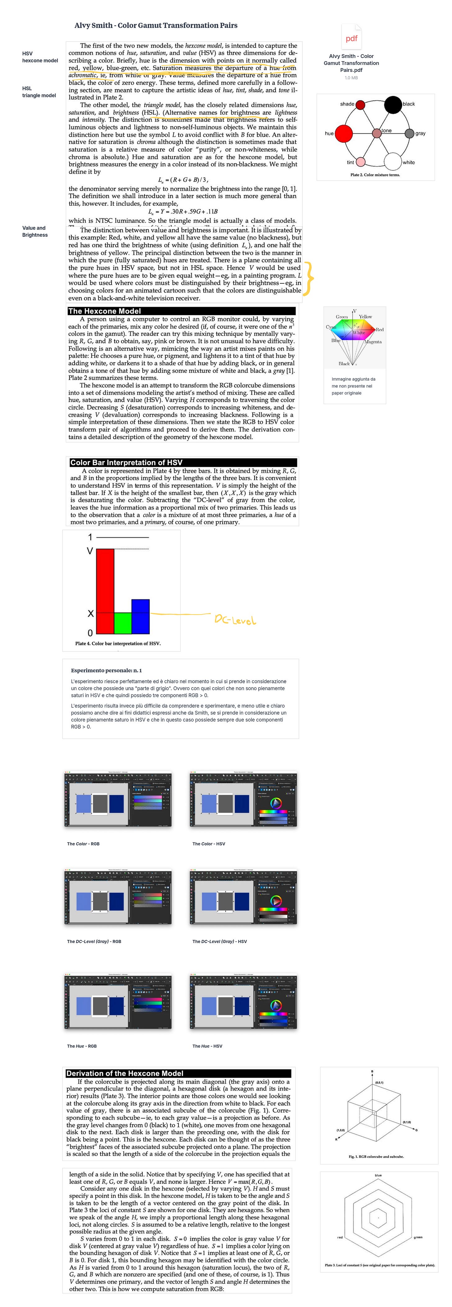 Alcuni passaggi del paper che descrive la correlazione tra l’HSV e l’RGB nel mondo del digitale, sono davvero illuminanti. Oltre al PDF del paper, qui di seguito ho inserito una mia immagine con alcune annotazioni.