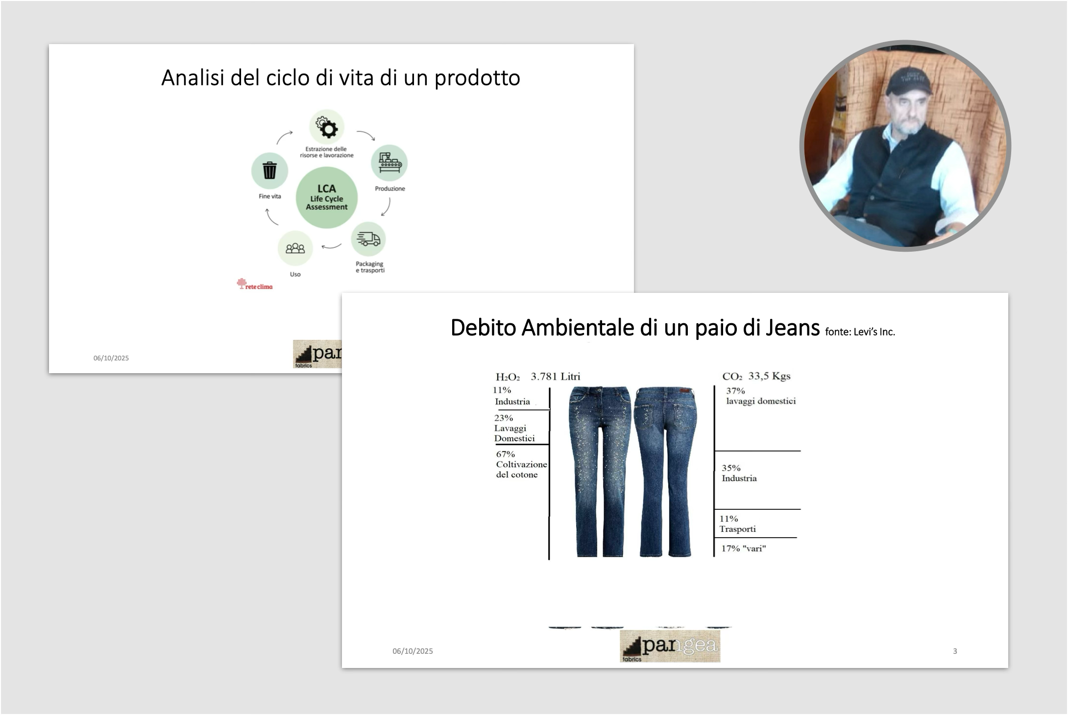 Per rendere tangibili questi concetti, Valenti ha scelto un oggetto simbolico: un paio di jeans. Secondo un’analisi condotta da Levi’s nel 2017, il ciclo di vita di un solo jeans richiede in media 3.800 litri d’acqua e produce 33,5 kg di CO₂.